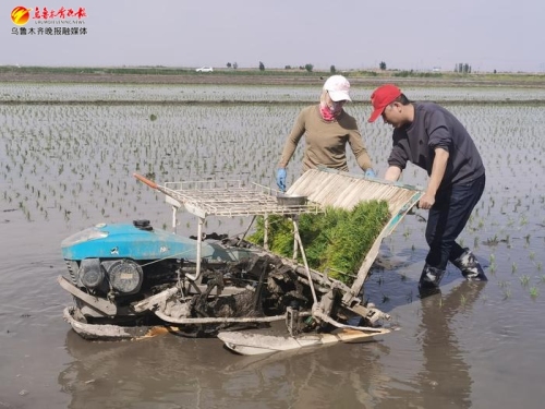 米东区三道坝镇皇宫村水稻田,与皇宫村结对的社区大洪沟社区的干部正在帮忙插秧。记者宋建华摄