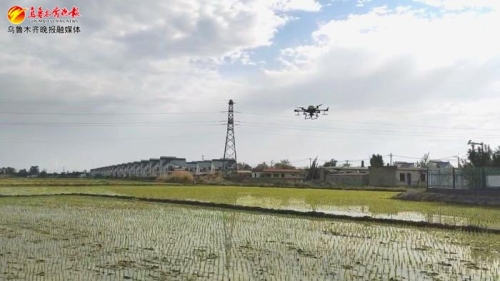 米东区三道坝镇皇宫村水稻田,无人机正在进行施肥作业。记者宋建华摄