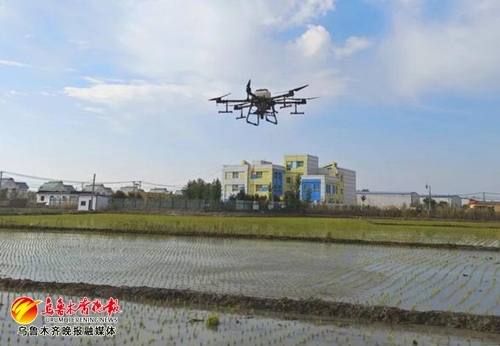 在米东区三道坝镇杜家庄村,无人机正在对稻田进行田间管理。记者宋建华摄