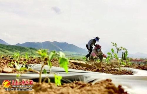在位于乌鲁木齐县水西沟镇平西梁村的昆仑农场“零碳”农业科技示范园,工作人员在栽苗。记者郭军鸽摄