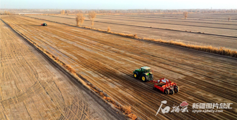 2022年11月23日,大型平地机在尉犁县墩阔坦乡库木巴格村2022年高标准农田建设项目现场平地作业。汪志鹏摄