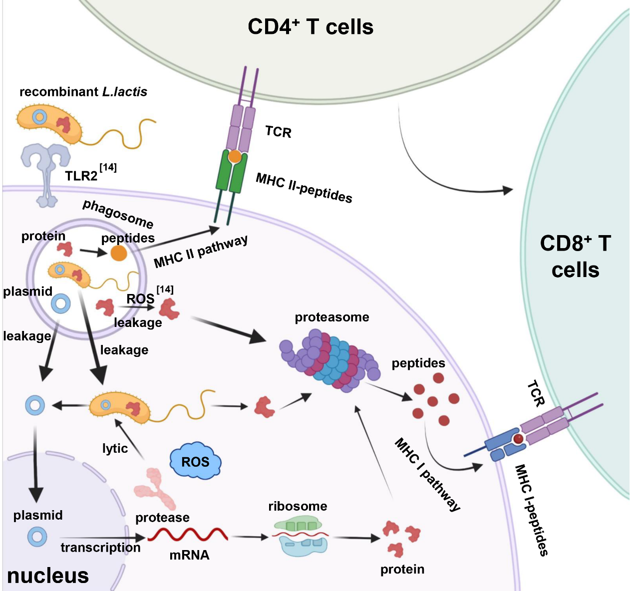 与此同时,另一部分蛋白、质粒以及未被裂解的重组L.L,则可通过ROS的作用破坏吞噬体膜,逃逸至细胞质中。在细胞质中,未被裂解的重组L.L可被胞质ROS及蛋白酶进一步裂解,释放出DNA和蛋白。释放的DNA进入细胞核进行转录,转录产物(mRNA)返回细胞质翻译成新蛋白。最终,这些存在于细胞质中的蛋白(无论是直接释放的还是新合成的)均可被蛋白酶体降解加工。加工产生的肽段与MHC I分子结合形成复合物,进而激活CD8+T细胞。此外,激活的CD4+T细胞也能进一步促进CD8+T细胞的活化。