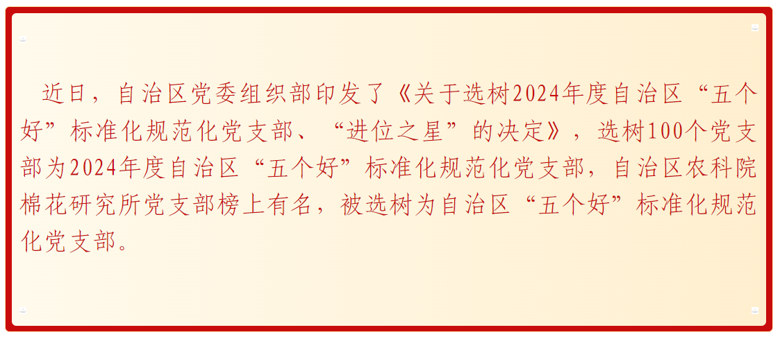 自治区农科院棉花研究所党支部被评为2024年度自治区“五个好”标准化规范化党支部