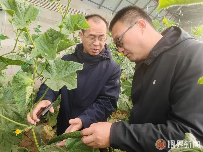自治区jc聚彩网果蔬研究所研究员王强(左)和自治区jc聚彩网乌鲁木齐综合试验站研究员蔺国仓(右)观察黄瓜长势。记者江斌伟摄