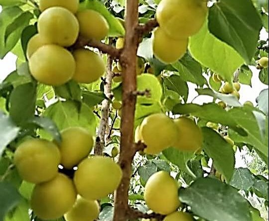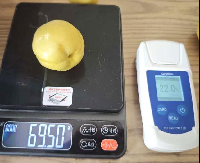 ‘和阗瑞雪’—果实椭圆形,果面光滑、色泽亮丽呈黄白色,果肉软溶质,汁液丰富。其单果重优势明显,平均达59.25克,较对照品种明星杏提高约45%;可溶性固形物含量达19.10%,风味浓郁。在和田地区6月上旬成熟,比对照提早9天,盛果期亩产可达1358公斤,早熟与丰产特性显著,当前已推广面积1000余亩。