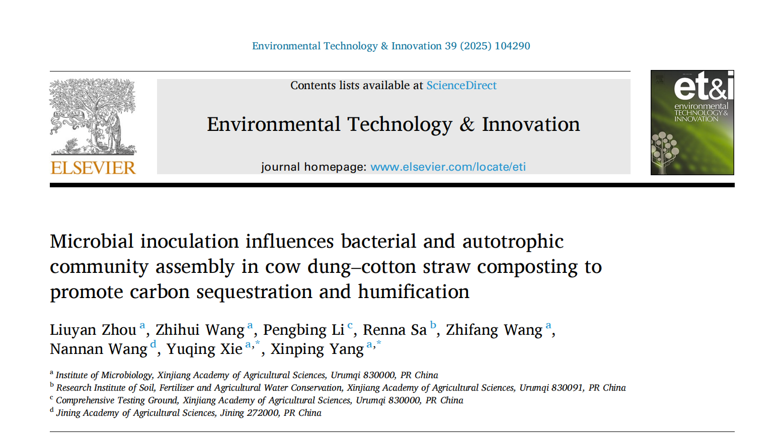 近日,自治区农科院微生物研究所农业有机物处理与资源化利用创新团队在国际知名学术期刊《Environmental Technology & Innovation》上发表题为“Microbial inoculation influences bacterial and autotrophic community assembly in cow dung–cotton straw composting to promote carbon sequestration and humification”。的学术论文(IF=7.1/Q1)。该研究在开展农林废弃物肥料化利用中,揭示了棉花秸秆-牛粪堆肥过程中有机碳固存和腐殖酸形成的生物强化机制。