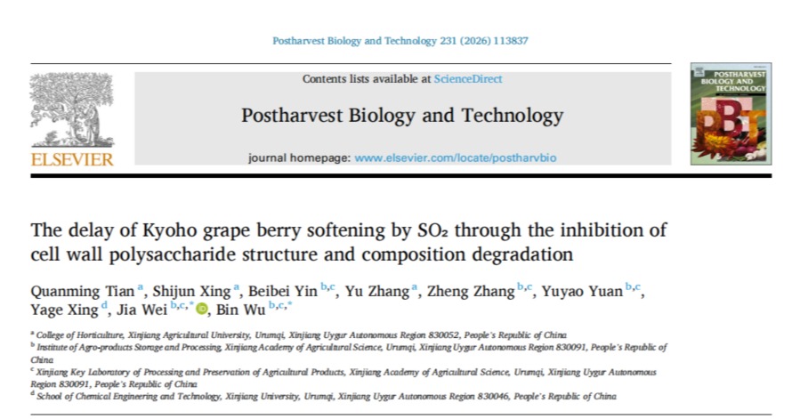 近日,自治区农科院农产品加工研究所贮运保鲜团队在国际知名期刊《Postharvest Biology and Technology》发表了题为“The delay of kyoho grape berry softening by SO2through the inhibition of cell wall polysaccharide structure and compositiondegra-dation”的研究论文(IF=6.8/Q1),该成果系统阐明了二氧化硫(SO2)通过抑制细胞壁多糖结构与组成降解延缓“巨峰”葡萄果实采后软化的分子机制。