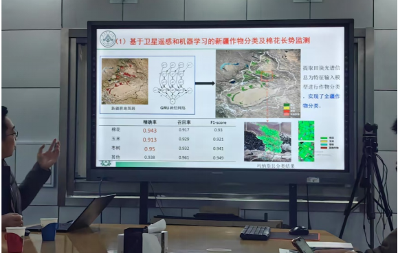 会上,张雷博士介绍了近年来团队基于卫星遥感和机器学习等相关研究成果,分别就基于模块化迁移学习的棉花水、肥监测模型的构建及处方图生成;棉花长势(化控)、成熟度(脱叶)及产量监测模型、智能化植保无人机变量喷洒系统及察打一体无人机、棉花黄萎病病害等级监测系统及设备、智慧棉田管控系统等内容进行了详细介绍,展示了棉花田间生产管理中“智能芯片”发挥的核心作用和运行机理。