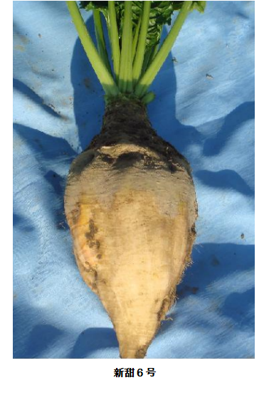 新甜6号是我院自育品种,属丰产偏高糖型多粒多倍体杂交种,是以7208-2四倍体品系为母本,以B63品系为父本,按3:1比例杂交选育而成。该品种生育期160-170天,属早熟偏高糖类型品种。抗褐斑病、根腐病、耐白粉病,适应性较广、耐水肥、耐盐碱、耐瘠薄,较抗旱,在水肥充足的管理条件下,单产高,增产潜力大。适宜在新疆的伊犁、塔城、博州、奇台、焉耆、阿克苏等地区种植。1985-1987年参加新疆甜菜品种区域试验,块根产量三年平均为4451千克/亩,较对照增产11.14%。含糖率17.94%,较对照提高0.65度。1988-1989年进行生产示范试验,平均块根产量4567千克/亩,较对照增产20.1%。产糖量820千克/亩,较对照增产25.66%。在新疆产区一般亩产3500-4100千克,高产田可达6000千克。1989年9月经新疆自治区农作物品种审定委员会审定命名。该品种曾在生产上使用了十余年,年覆盖面积达全疆面积的70%以上,是新疆农科院推广面积最大的甜菜自育品种,曾获新疆维吾尔自治区科技进步二等奖及国家科技进步三等奖。