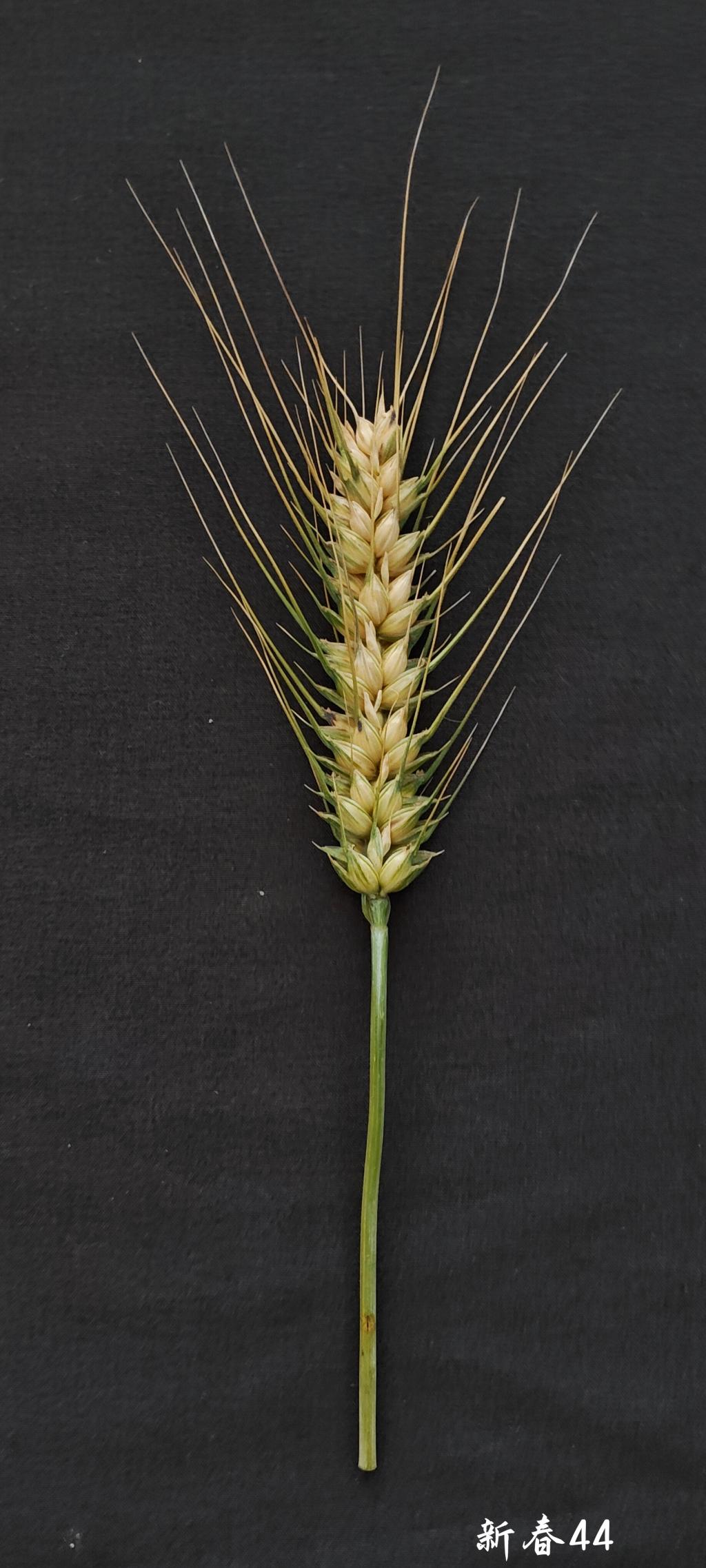 该品种为春性品种,生育期101天。株高88cm左右,茎秆粗壮,抗倒伏性强。穗层整齐,穗长10-11cm。千粒重46-48g,容重800-813g/L,口松、易落粒,成熟后及早收获。新春44号聚合优质麦谷蛋白亚基1、7+8和5+10,优良面粉色泽相关2个分子标记多酚氧化酶PpoD1和黄色素ZdsA1,品质性状优,籽粒蛋白质含量为15.98%,湿面筋含量为34.6%,面粉吸水率为60.3%,面团稳定时间17.5min,面团最大拉伸阻力503E.U,面团延伸性191mm,面包体积930mL,面包重量140.6g,面包总评分95.5分,达到国家强筋小麦标准。同时该品种含有抗叶锈病分子标记Lr46,田间病害鉴定结果为高抗小麦叶锈病和白粉病,该品种适应性较广,适合新疆春麦主产区的焉耆盆地、昌吉州、塔城地区、阿勒泰地区以及博州等地种植。