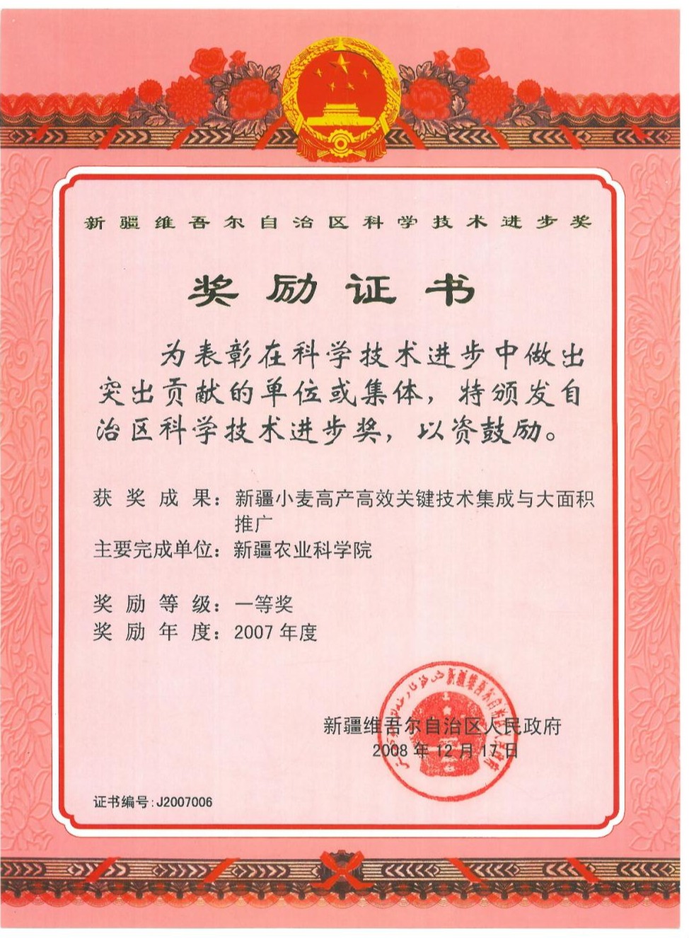 成果简介:2003年新疆小麦种植面积持续下滑到933万亩,为近三十年来的最低,总产335万吨,粮食安全的形势严峻。为此,自治区党委科技兴农领导小组办公室和自治区科技成果管理办公室分别下达了“新疆小麦大面积高产综合技术集成与示范”和“新冬18号、新春6号等小麦优良品种推广及高产高效栽培技术示范推广”项目。本项目成果是两个项目研究和示范推广成果的整合。