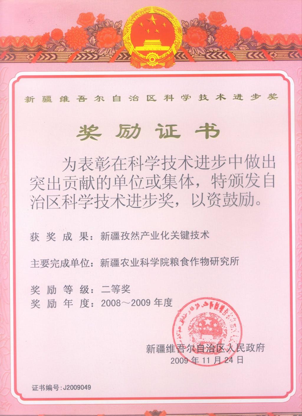 成果简介:项目针对孜然产业发展中存在的品种、栽培技术及精深加工工艺等关键技术进行攻关。在国内首次选育成高产优质新品种新孜然1号和新孜然2号,实现了我国孜然品种零的突破;在国内首次发布"无公害孜然生产技术规程"新疆地方标准,制定了玉米套种孜然栽培技术要点和棉花套种孜然栽培技术要点,大面积应用推广取得成功;建立新疆孜然风味油脂高效提取、精制与重新固化技术新体系,研制出孜然调味油新产品2个(孜然芳香油与孜然精油);在国内首次发布“孜然”籽实等级新疆地方标准和“孜 然 油(枯茗油)”产品质量新疆地方标准各1项,“安息茴香油树脂”产品质量企业标准1项,为新疆孜然产品的精深加工提供了技术和开发储备;在《新疆农业科学》《粮油食品》《中国农技推广》和《新疆农业科技》等核心杂志上发表论文11篇,其中“安息茴香油脂的超临界CO2提取工艺研究”一文获自治区第七界自然科学优秀学术论文二等奖。