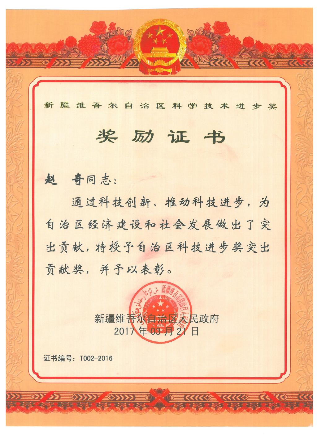 赵奇同志获2016年自治区科技进步奖突出贡献奖。