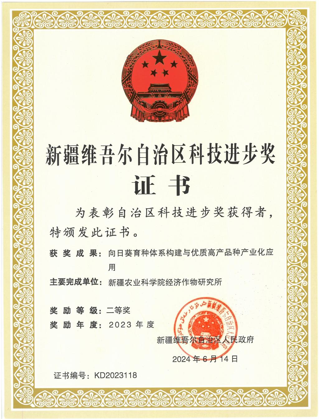 向日葵育种体系构建与优质高产品种产业化应用项目获得2023年自治区科技进步二等奖。该项目针对我国向日葵品种抗病抗列当性差、产量低而不稳、不适于机械化收获等突出问题,历时10余年,系统开展了向日葵种质资源收集与鉴定、优异种质创制、育种技术与栽培技术创新等研究。项目授权国家发明专利2项、实用新型专利1项、品种权1项、软件著作权2项;出版《油葵》专著、发表论文18篇,其中SCI论文6篇。登记向日葵新品种7个,育成品种累计推广1050万亩,在向日葵育种技术、优质高产、抗病抗逆品种选育及应用上取得突破性成果,解决了向日葵生产中的技术难题,获得了显著的经济效益。