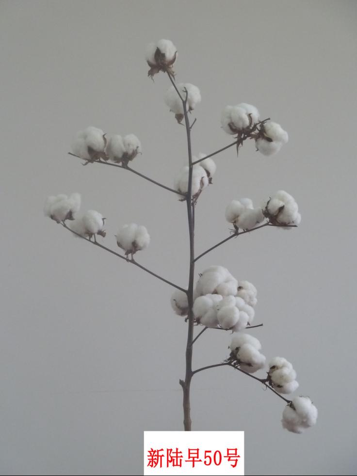 新陆早50号是自治区农科院选育的早熟陆地棉品种,2011年通过新疆审定。植株塔形,生育期125天,单铃重5.5g,适合机采。高产稳产,皮棉亩产最高达300kg。纤维品质优良,上半部长度30.16mm,断裂比强度29.43cN/tex,马克隆值4.02。高抗枯萎病,轻感黄萎病。2011-2018年在北疆广泛推广,累计1200余万亩,是首个地方审定进入兵团且最适宜机采的棉花品种。