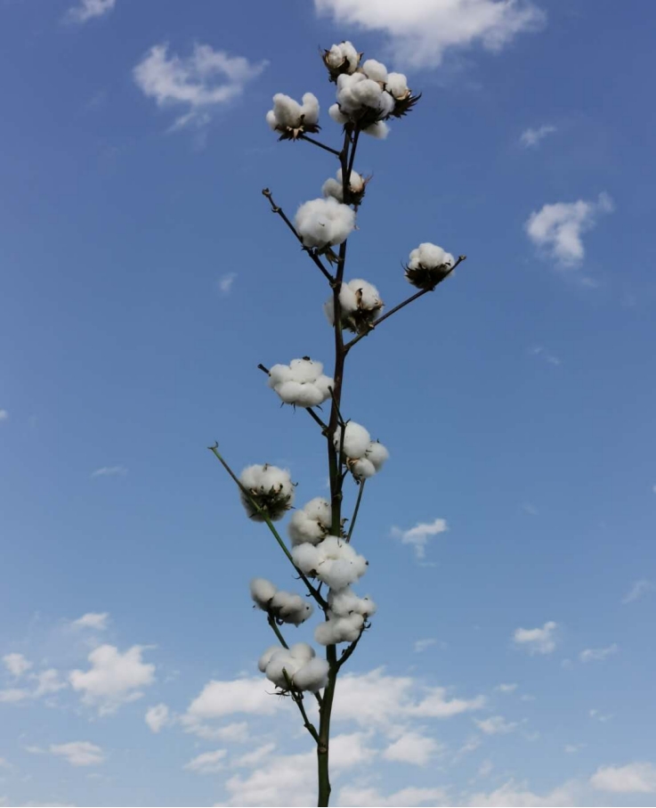 新农棉1号是自治区农科院选育的早熟陆地棉品种,于2011年在甘肃审定。株型筒型,Ⅰ-Ⅱ式果枝,生育期122天,单铃重5.8g,结铃性强,吐絮畅,机采性能优异。2019年玛纳斯县村实收籽棉亩产达536kg,达到了超高产水平,纤维品质突出,上半部长度31.6mm,断裂比强度31.5cN/tex,马克隆值4.3。高抗枯萎病、耐黄萎病,茎秆粗壮,水肥利用率高,全程长势强,适应性广。