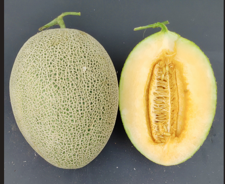 品种特性:晚熟甜瓜品种,全生育期100—110天,果实发育期60天左右。果实短椭,黄墨绿皮带隐花条,全网纹或半网纹。橘红肉、肉质细、松脆爽口,汁多味好,果实中心含糖量15%,一般单瓜重3—4公斤,易结果。该品种高抗白粉病,适合露地栽培。