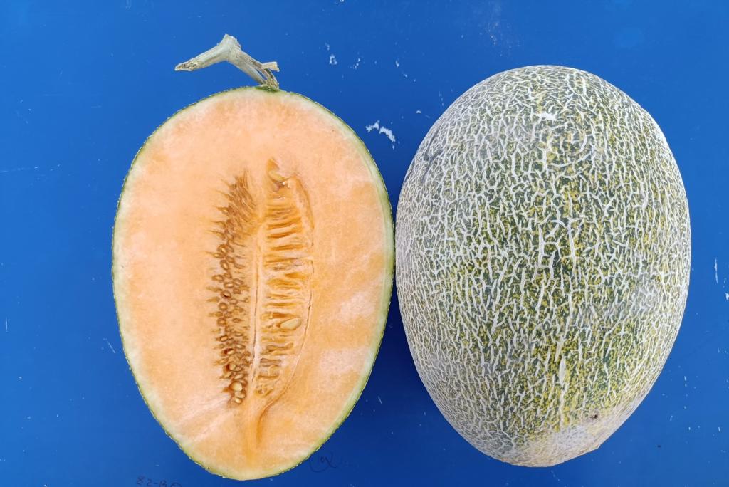 品种特性:中晚熟哈密新品种,生育期100天左右,果实发育期55天,单瓜重2.0-2.5千克,结果性强、座果整齐一致,果实短椭近圆、黑绿皮、全网纹,肉色橘红、肉质细脆稍紧、味甜,中心含糖量16%,植株生长势强,抗病性较强,尤其抗白粉病。