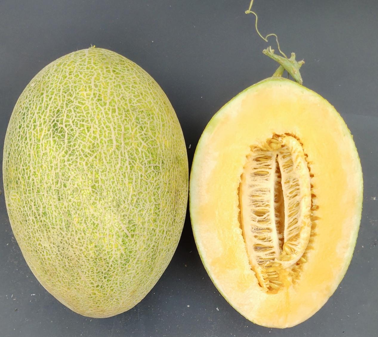 品种特性:中晚熟甜瓜品种,全生育期85—100天,单瓜种3.5kg左右,易座果,座果整齐,产量高,中心含糖量可达18%;果型椭圆,果皮浅绿泛黄、中粗网全,肉色桔,肉质松脆爽口,风味浓,味道佳,植株长势旺盛、极抗白粉病,在喀什地区种植可以全程不用防治白粉病。